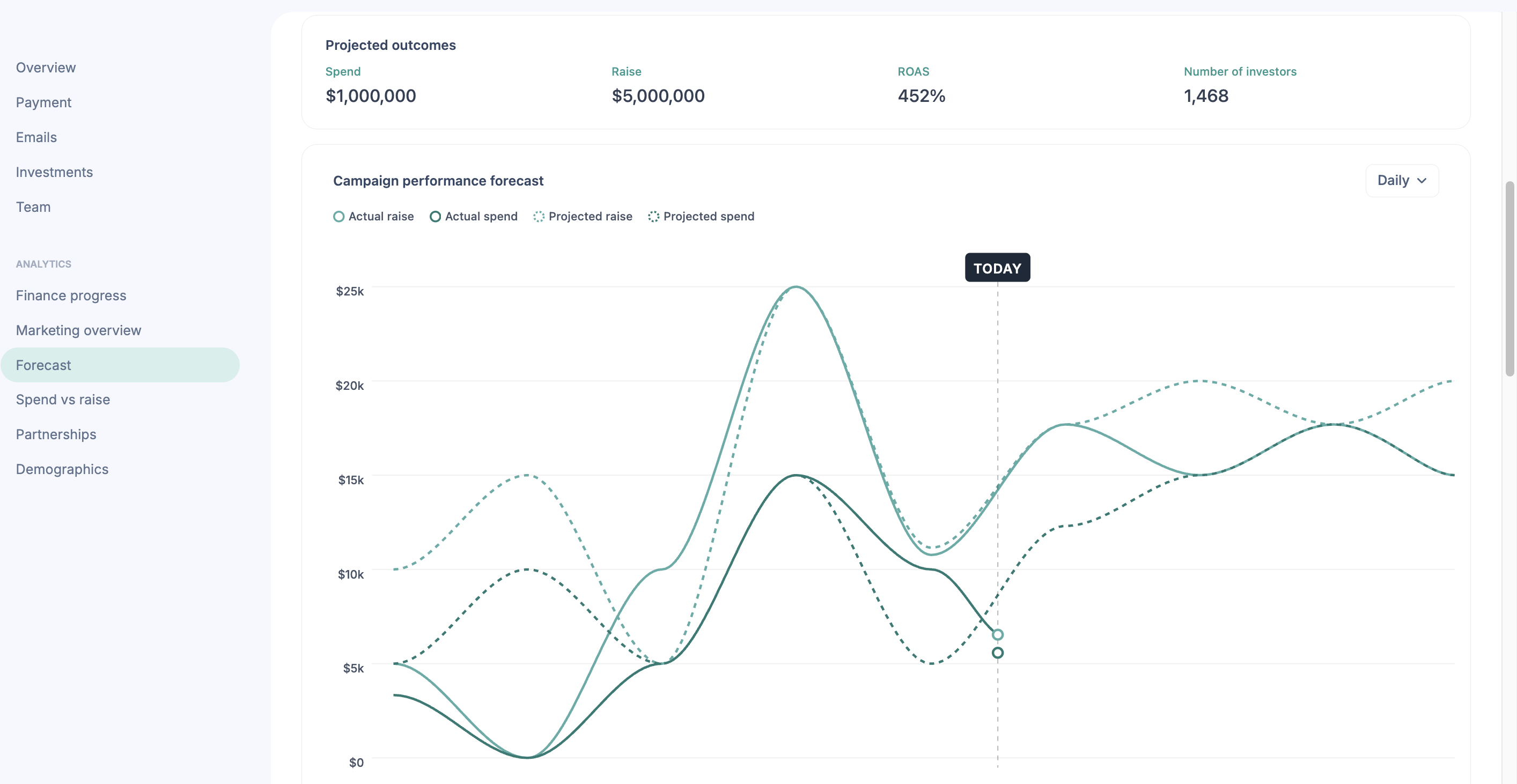 - An Interactive Forecast Graph. A visual chart shows the full lifecycle of your raise, from your campaign start date through your end date. Two data series are overlaid on the graph: your actuals (real performance data pulled from live ad platforms) and your forecast (the projected performance generated by your DealMaker strategist’s model). You can toggle between daily, weekly, and monthly views to zoom in on short-term trends or zoom out for the big picture.