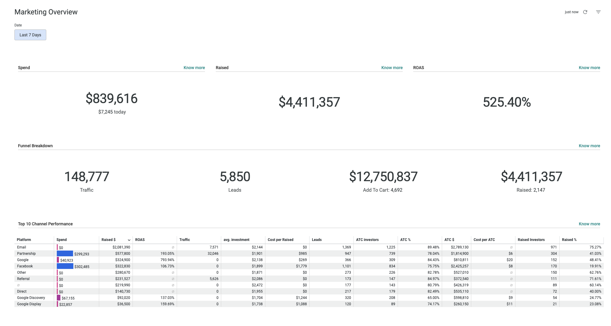 Founders and marketers told us they needed a fast, trustworthy answer to a simple question: “how are we doing?” Performance Dashboards deliver the signal without the noise. See marketing spend, funds raised attributable to marketing, ROAS, funnel health, top channels, partnership performance, and investor demographics in one place. Data sits on a new business‑intelligence foundation and refreshes with bi-hourly updates for consistent, near real‑time numbers that match what your DealMaker strategist sees. Security is built in through your standard login and deal‑level permissions.